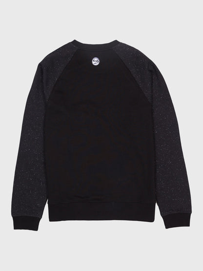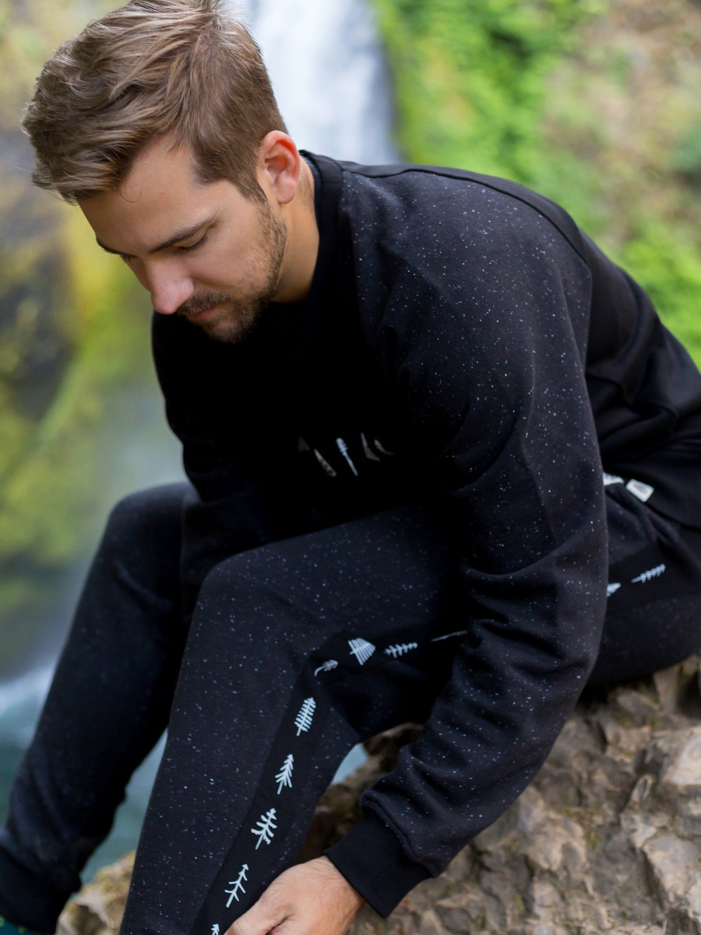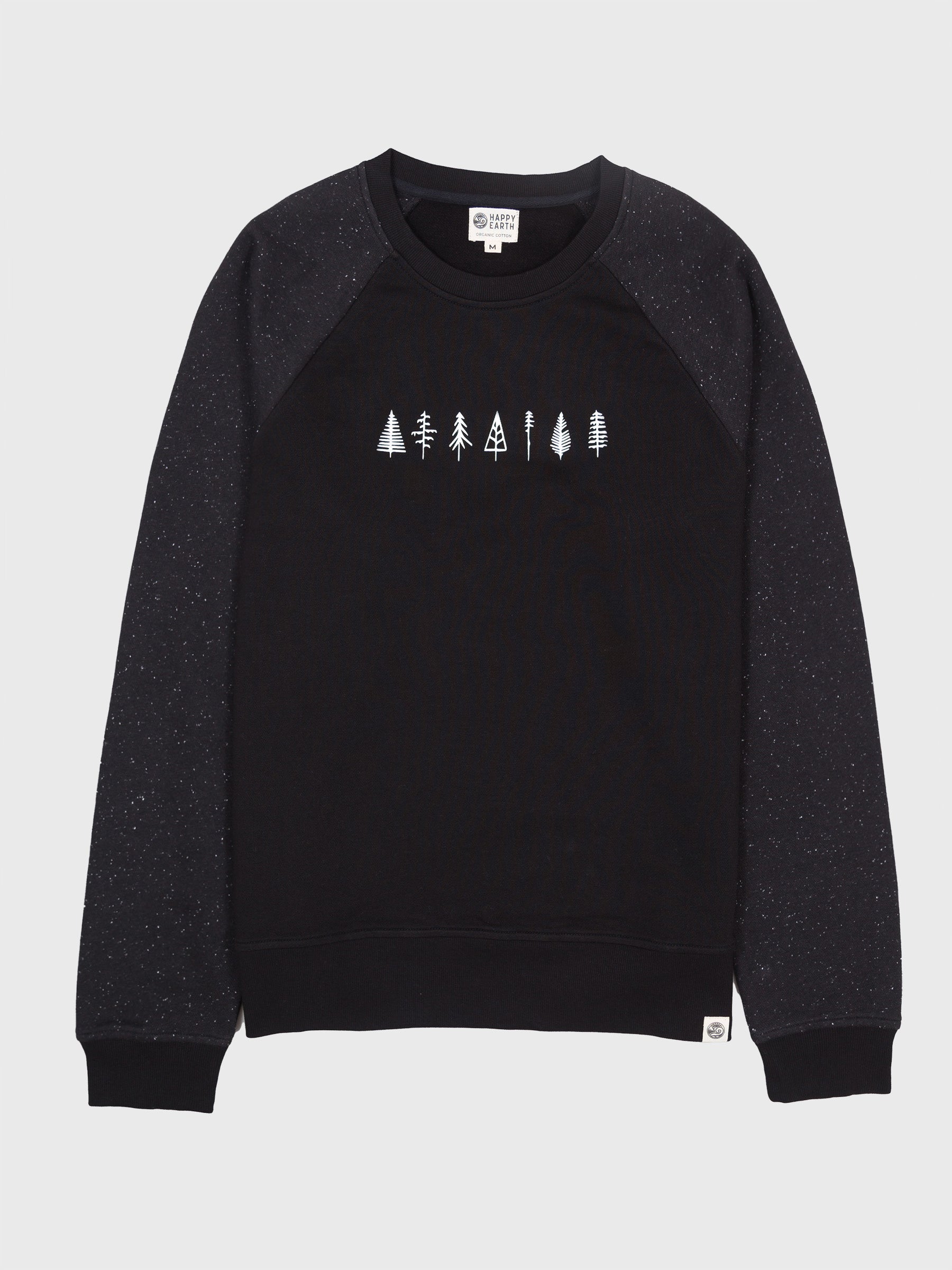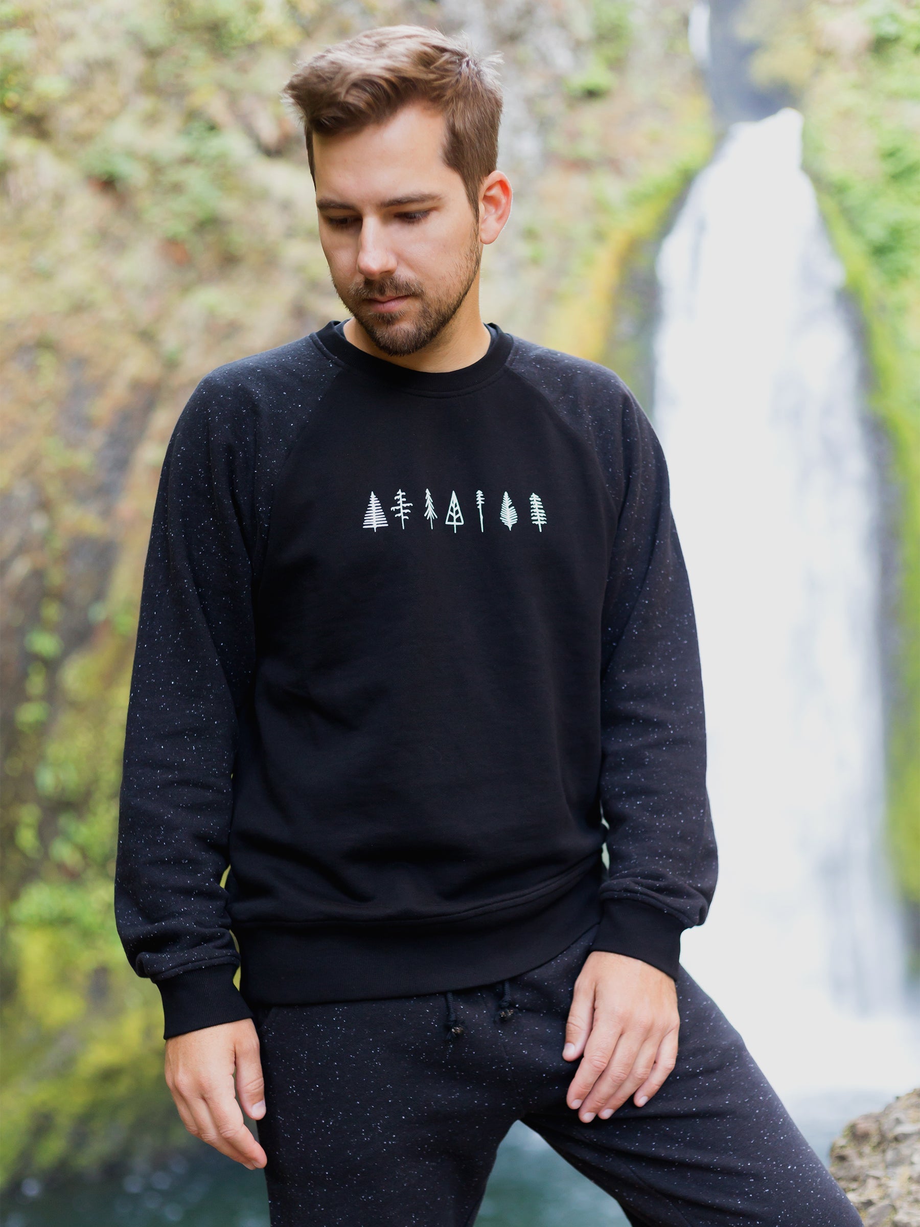 Ultra-soft fleece raglan sweatshirt made Fair Trade from premium organic cotton. Relaxed silhouette and all-gender, flattering fit. Solid black body accented with 7 hand-drawn trees. Speckled charcoal raglan sleeves.