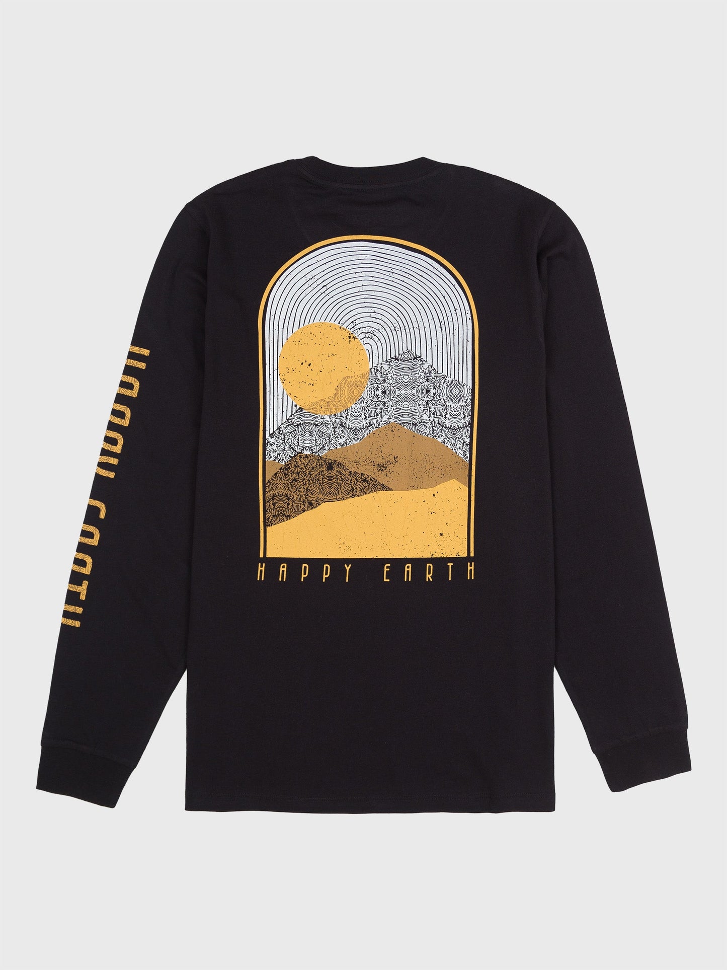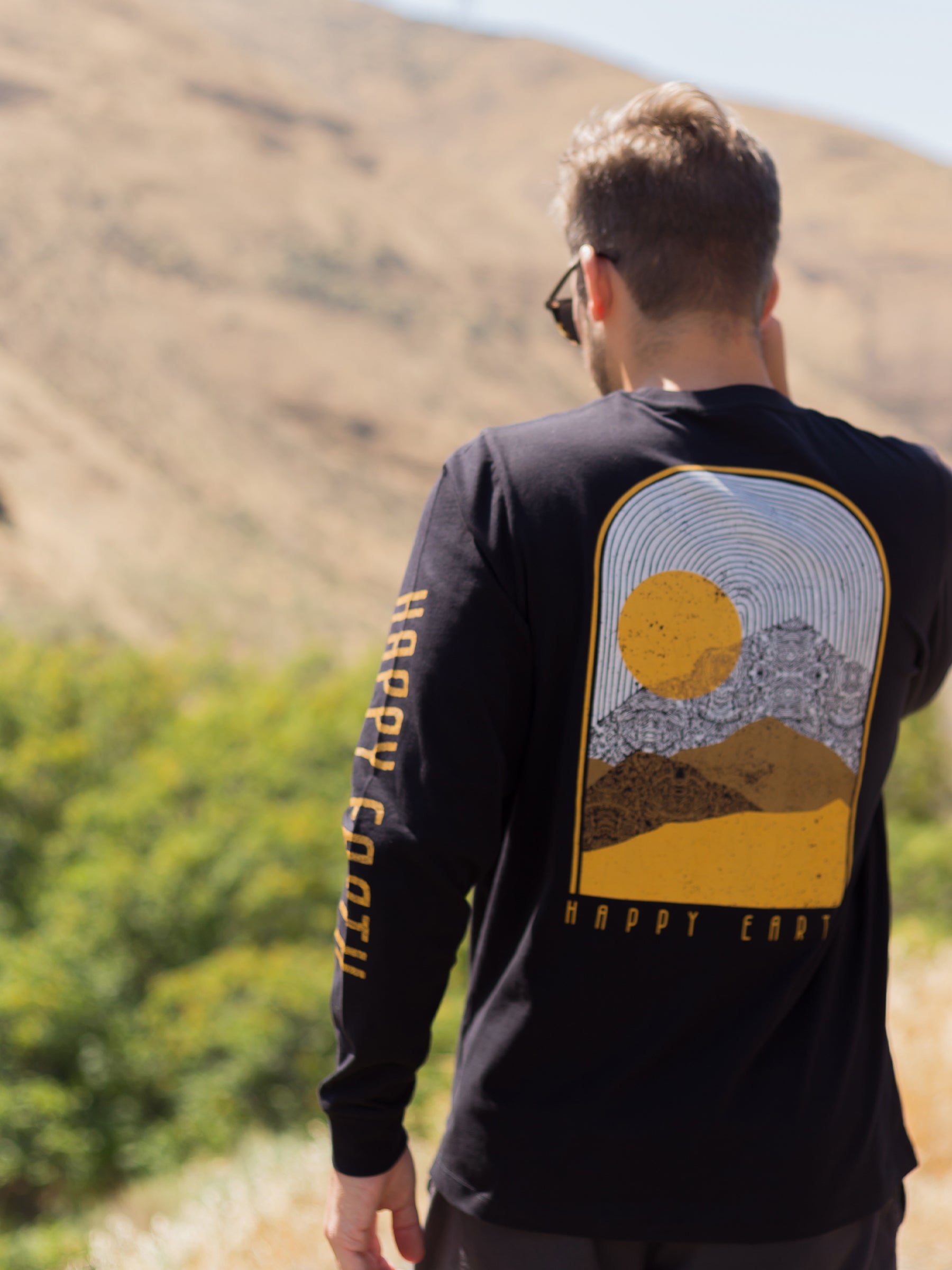 The best views come after the hardest climbs. This design awards you the gold, in the form of bold mountain peaks and a setting sun. Hand-drawn patterns in artistic relief suggest the appearance of rugged cliffs and shadows.