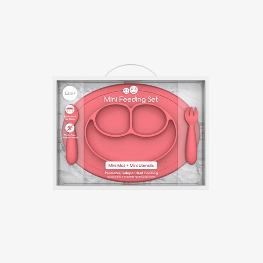 As your infant transitions to toddlerhood, they are ready to start practicing new mealtime milestones. They are eating a balanced meal with different food groups and are learning how to eat with a spoon (scooping) and fork (piercing). With the Mini Feeding Set (the Mini Mat, Mini Spoon and Mini Fork) ezpz provides all of the developmental tools you need for independent mealtime with your toddler.BluePewterSageBlushOlive -