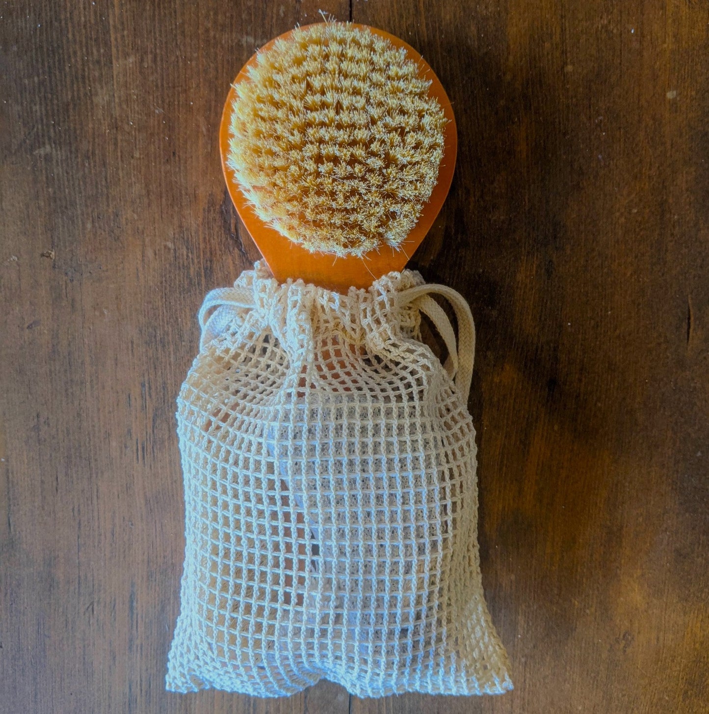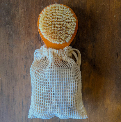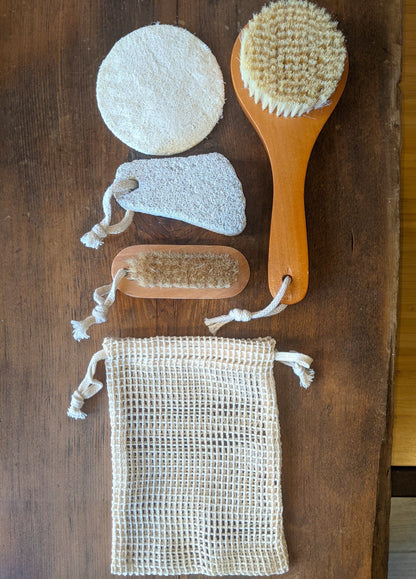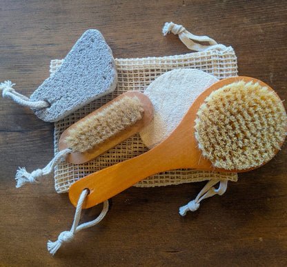 The set contains a Natural Plant Bristled Body Brush, a Dual Sided Wooden Nail Brush, a Natural Pumice Stone and a Natural Loofa Disc. The cotton spa satchel which houses the set can be used as a soap pouch (100% Cotton). Dimensions: 8" x 6"