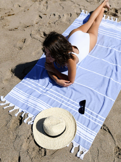 Understated luxury in classic stripes and pleasing hues finished with a playful fringe. Our classically designed Turkish towels are plush, eye-catching, and envy-inspiring. Use these towels for a picture-perfect beach day, or to elevate your everyday bathing ritual with a chic set of inviting colors. Also available as a matching hand towel.