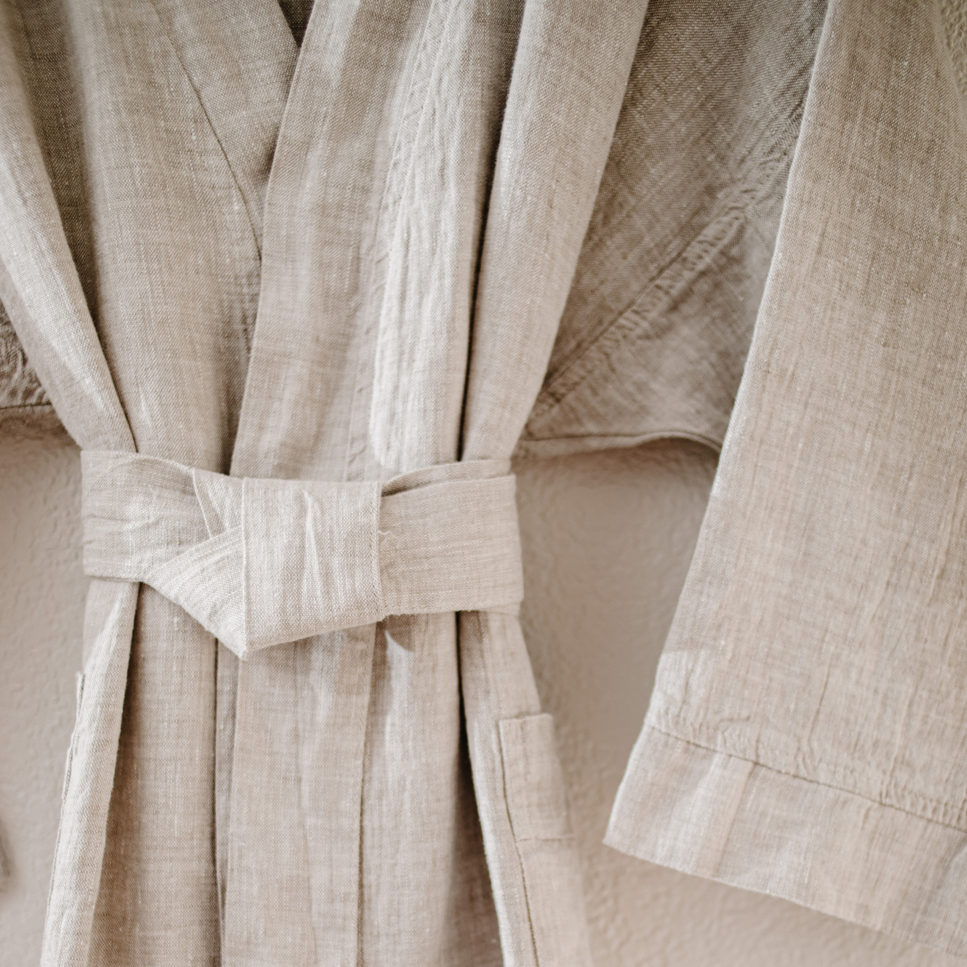 Linen bathrobe made in Kimono style, unisex relaxed fit. It has two front pockets and a belt