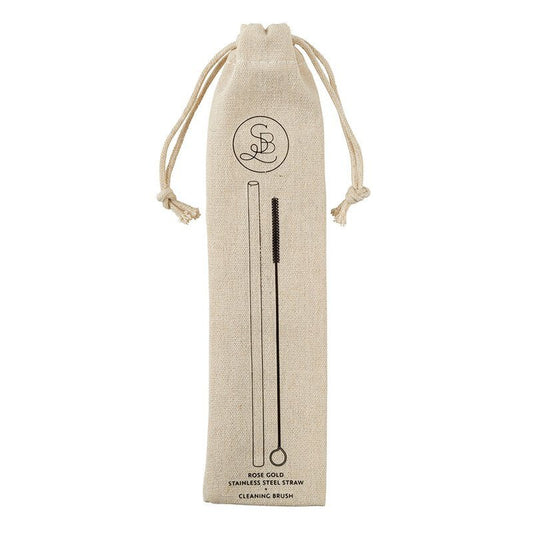 - Includes a linen drawstring carry bag, one gold-finished stainless steel straw, and cleaning brush