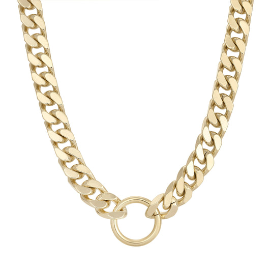 The Tate necklace is made from our thick squared-off curb chain, fastened with a with lobster clasp and has a round accent ring.