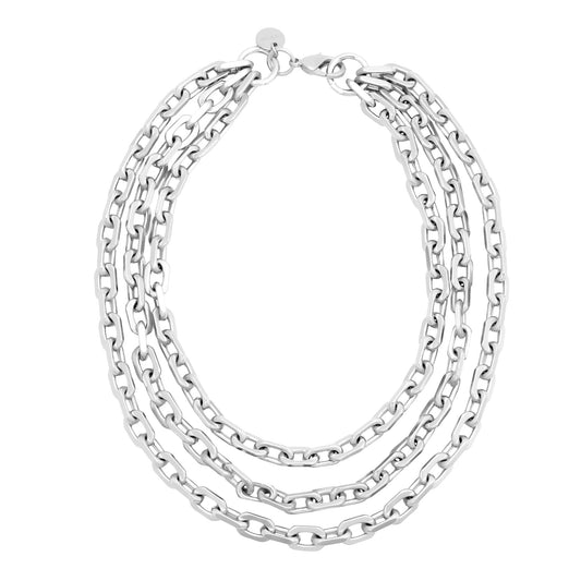 The Triple Layer Lennon necklace is made from thick recycled brass cable link chain, fastened with a with lobster clasp. Finishes available: 14k Gold or Rhodium-Silver