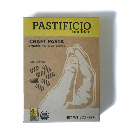 Pastificio Boulder RIGATONI - Heritage and ancient wheat pasta craft pasta made from organic, freshly milled heritage and ancient grains. Pastificio Boulder RIGATONI - Heritage and ancient wheat pasta is slow dried, whole grain and certified organic. Pastificio Boulder RIGATONI - Heritage and ancient wheat pasta case of 12 x 8oz boxes.