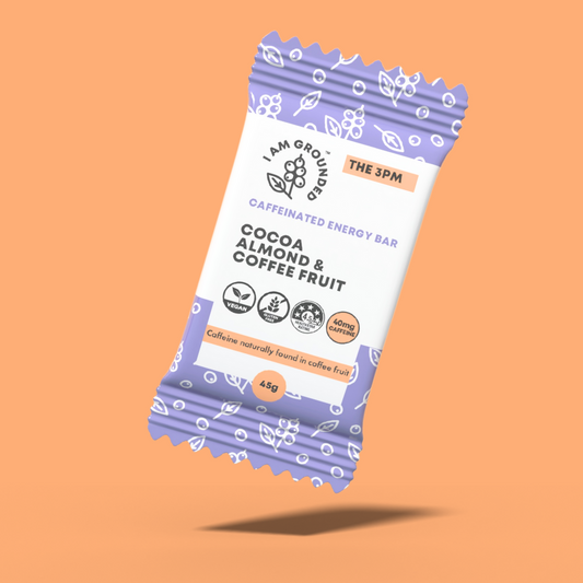 I Am Grounded THE 3PM - Cocoa, Almond & Coffee Fruit bar is perfect for those chocolate lovers looking for a 3PM fix! I Am Grounded THE 3PM is flavanoid rich cocoa, combined with vitamin-E-packed almonds make this a perfect afternoon brain boost. Tastes like a brownie, with the natural sweetness of coffee fruit.