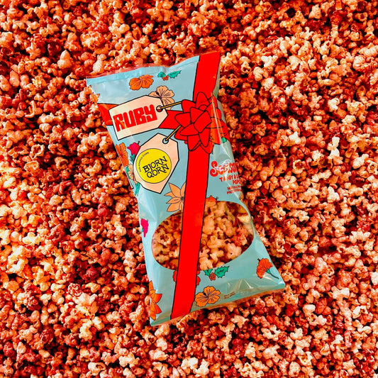 Bjorn Qorn Ruby Popcorn is Bjorn Qorn's new seasonal limited edition flavor, BjornQorn Ruby! Bjorn Qorn Ruby's friends over at Ruby Hibiscus Water showed us the wonders of their hibiscus extract, and then we accidentally dumped it all over our popcorn. Whoops! But hold on.. i think we have something here.. The tanginess went through the roof, and with a salty bite we were seeing red. It was like a salt and vinegar chip in a flamin' hot cheeto costume.
