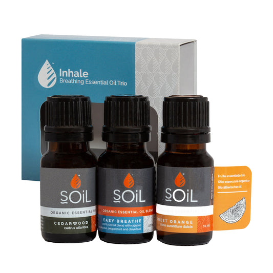 The Breathing Trio of organic essential oils Easy Breathe Blend 10ml, Cedarwood 10ml and Orange 10ml. -