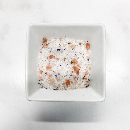 Pure Epsom salt, organic compliant sea salt, organic compliant pink Himalayan salt, organic & wild-harvested rose petals, organic cornflower, White Peony Tea, phthalate-free fragrance.