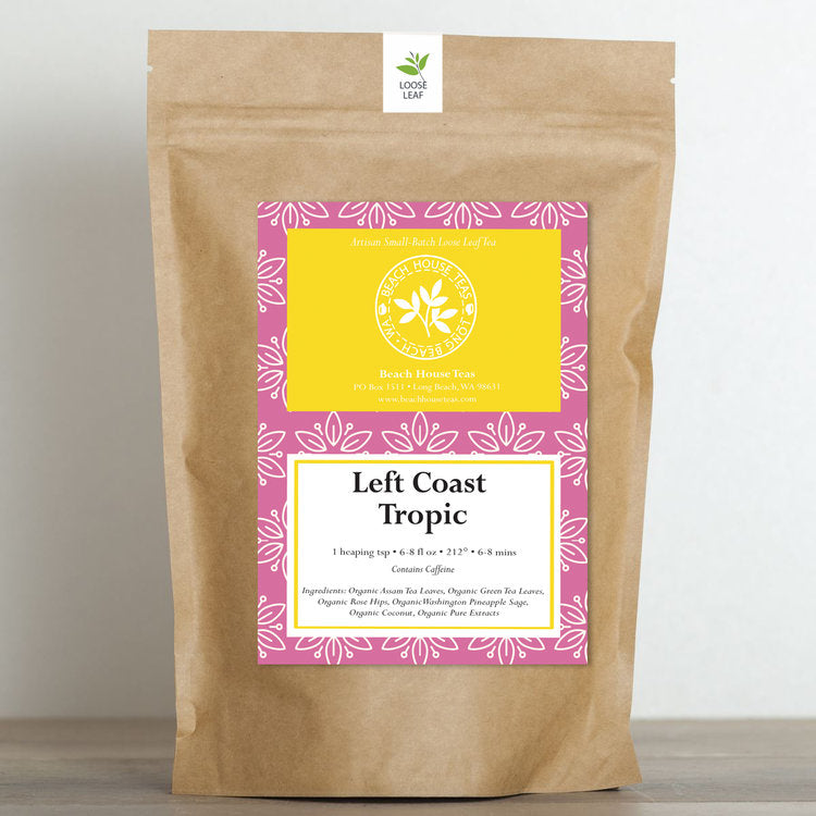 Transport yourself to a lush tropical paradise with our Left Coast Tropic Tea, a 100% organic loose leaf blend that's a true taste of the tropics. Crafted with care, this tea combines the richness of organic Assam tea and the vibrancy of green tea, creating a harmonious base for your sensory journey.