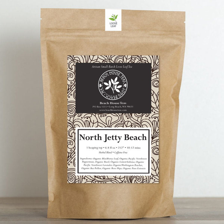 Experience the refreshing and invigorating flavors of North Jetty Beach, a 100% organic loose leaf tea that's a true celebration of the Pacific Northwest. Crafted with care, this blend features the natural goodness of organic blackberry leaf, Pacific Northwest peppermint, basil, Washington peaches, and Pacific Northwest lavender. With a touch of sweetness from bee pollen, it's a light yet bold tea that captures the essence of the region.