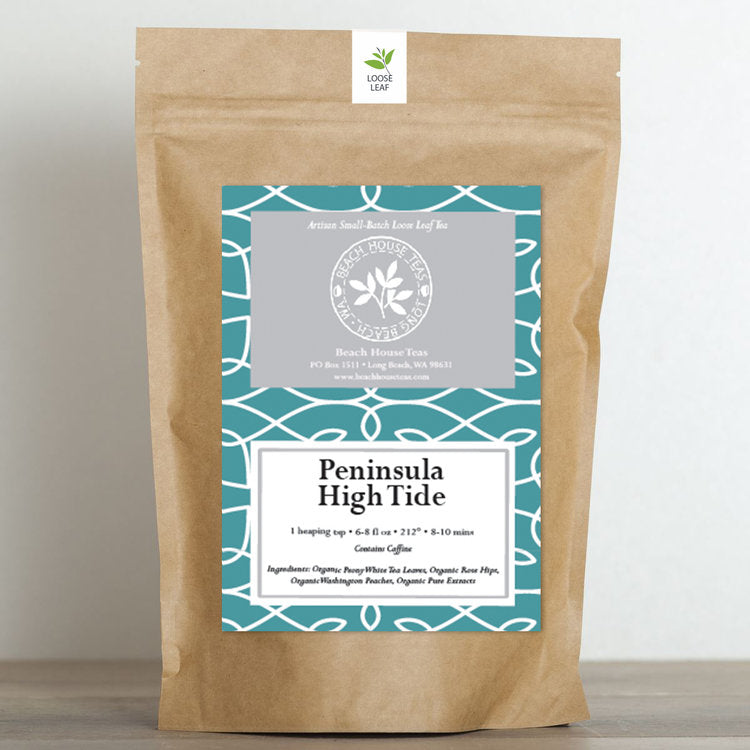 Peninsula High Tide is a 100% organic loose leaf tea that's a true taste sensation. Crafted with care, this blend features organic peony white tea, rose hips, and the delightful sweetness of organic Washington peaches.