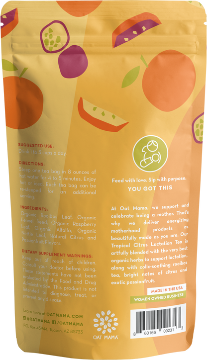 Our Tropical Citrus lactation tea is artfully blended with the very best organic, milk-boosting herbs, bright notes of citrus, exotic passionfruit, and colic-soothing rooibos. Every breastfeeding journey is unique. We believe your tea should be too.