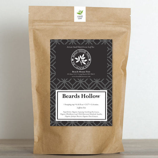 But that's not all – Beards Hollow Tea carries an added touch of the coastal uplands' woodland charm. Infused with wild foraged Western Hemlock needles and organic juniper berries, this tea evokes the serene beauty of the Pacific Northwest's forests. With each sip, you'll find yourself transported to a secluded hideaway amidst the woods, where the aroma of smoky fires and the essence of the forest dance in perfect harmony.