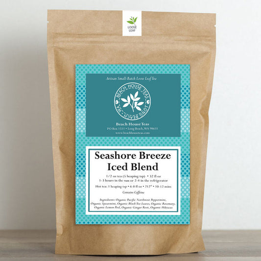 Seashore Breeze iced blend is 100% organic leaf tea blended with peppermint, spearmint, black tea, rosemary, ginger root, hibiscus, and a twist of lemon peel. This fun tea is a deliciously bright and slightly spicy tea to quench any summertime thirst. It will cool you down when it's hot outside with this refreshing iced blend.