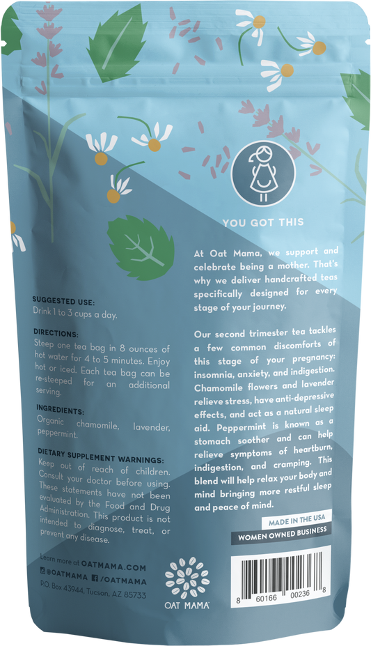 Our Second-Trimester Calm Tea tackles a few common discomforts of this pregnancy stage: sleep trouble, anxiety, and indigestion. Chamomile flowers and lavender relieve stress, have anti-depressive effects and act as a natural sleep aid. Peppermint is a stomach soother and can help relieve heartburn symptoms, indigestion, and cramping. This blend will help relax your body and mind bringing more restful sleep and peace of mind.Each bag comes with 14 biodegradable plant-based tea sachets.Ingredients: Organic Chamomile, Lavender, PeppermintConsult your doctor before using. These statements have not been evaluated by the Food and Drug Administration. This product is not intended to diagnose, treat, or prevent any disease.