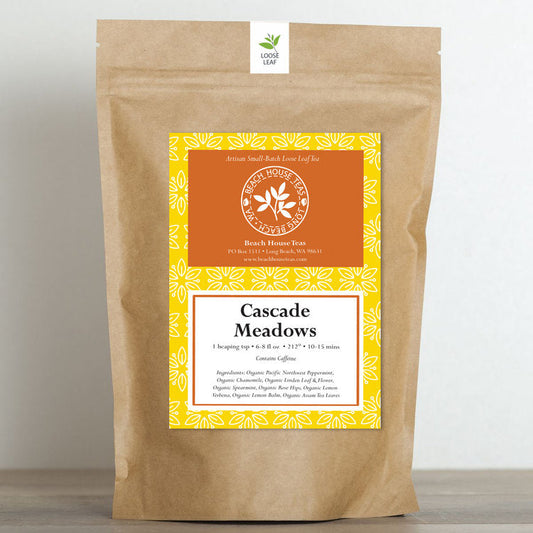 Vendor:Beach House TeasRegular price From $19.20Regular priceUnit price perSale price From $19.20🤝🏽 Fair Trade 🐝 Organic 🌊 Plastic FreeCascade Meadows is 100% organic loose leaf black tea blended with Pacific Northwest peppermint, chamomile, linden, spearmint, rose hips, lemon verbena, lemon balm, Assam tea for a vibrant tea sensation. Reminiscent of hiking through the mountains and coming upon a beautiful meadow of wildflowers. A delight you will return to over and over again.