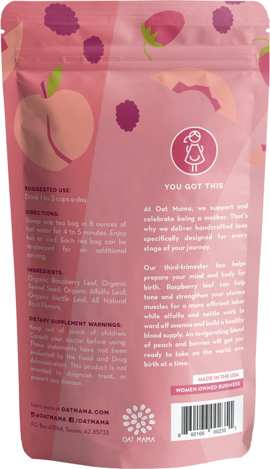 Our third-trimester tea helps prepare your mind and body for birth. Raspberry leaf can help tone and strengthen your uterine muscles for a more efficient labor while alfalfa and nettle work to ward off anemia and build a healthy blood supply. An invigorating blend of peach and berries will get you ready to take on the world, one birth at a time.Each bag comes with 14 biodegradable plant-based tea sachets.Ingredients: Organic Raspberry Leaf, Organic Fennel Seed, Organic Alfalfa Leaf, Organic Nettle Leaf, All Natural Fruit Flavors.Consult your doctor before using. These statements have not been evaluated by the Food and Drug Administration. This product is not intended to diagnose, treat, or prevent any disease. -