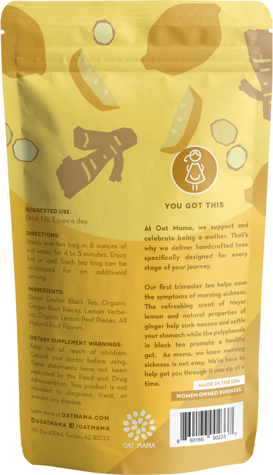 Our Morning Sickness Tea helps ease the symptoms of morning sickness experienced in pregnancy. The refreshing scent of Meyer lemon and natural properties of ginger help curb nausea and settle the stomach while the polyphenols in black tea promote a healthy gut.We know firsthand morning sickness is hard. We're here to help get you through it one sip at a time.Each bag comes with 14 biodegradable plant-based tea sachets.Ingredients: Decaf Ceylon Black Tea, Organic Ginger Root Pieces, Lemon Verbena, Organic Lemon Peel Pieces, All Natural Fruit FlavorsConsult your doctor before using. These statements have not been evaluated by the Food and Drug Administration. This product is not intended to diagnose, treat, or prevent any disease. -