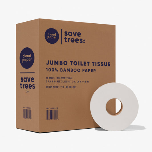 Bumroll sheets are 4 x 4 inches each with 400 sheets per roll, available in smaller packages and bulk bathroom Tissue with 12, 24, 36, 48, 72, and 96 toilet paper rolls per case. Available in subscription or one time purchase. "The production of recycled paper has significant environmental advantages over virgin (nonrecycled) paper production, including less impact on forest resources, less air pollution, less water pollution, less water consumption, less energy consumption, and less solid waste, quoted from CalRecycle.