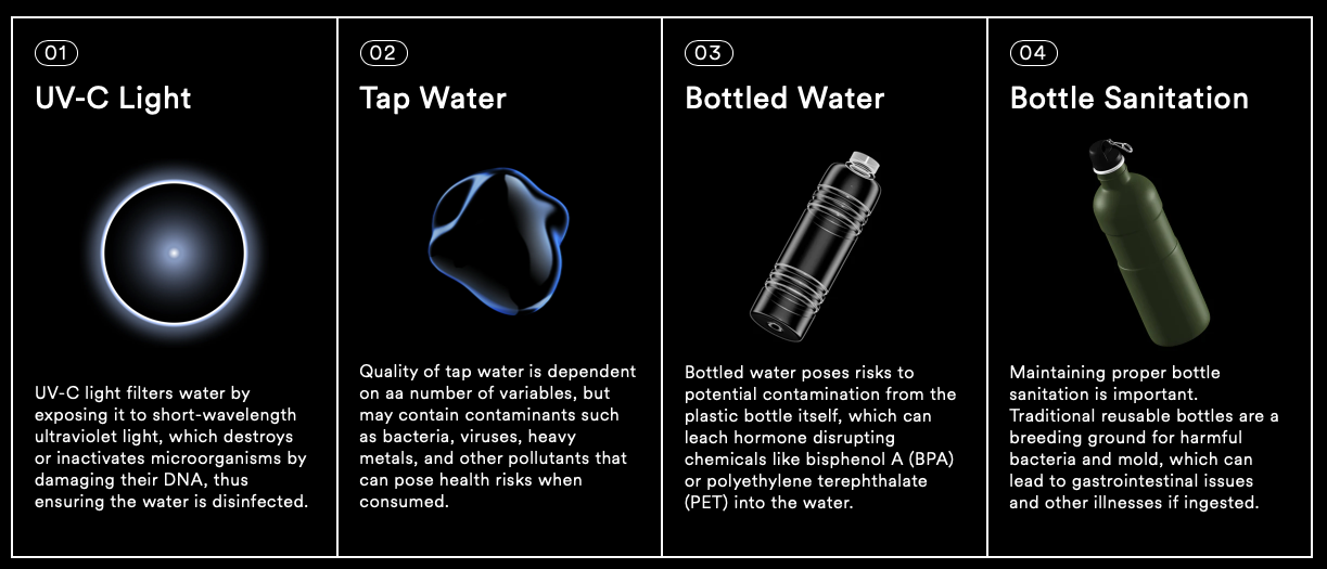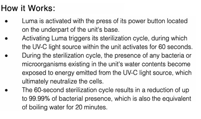 Luma 1.0 is a self-cleaning, vacuum insulated water bottle that integrates UV-C light technology to eradicate up to 99.99% of bacteria from the unit's water contents and interior surface.