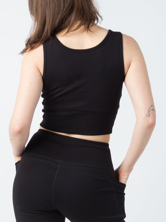 Structured support where you want it, stretchy comfort where you need it. Designed to be worn in two ways, this crop tank is made with a deep v-neck and alternative scoop neck.