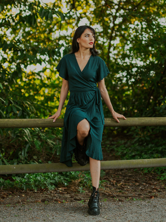 Curve friendly and flattering for all body types. Our emerald green floral wrap dress is great for nursing or pumping mothers.