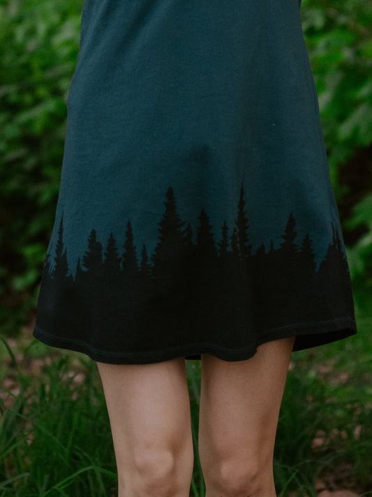 For the person at home among trees. Wear the wilderness with this unique nature-inspired dress, accented with a forest silhouette along the hem.