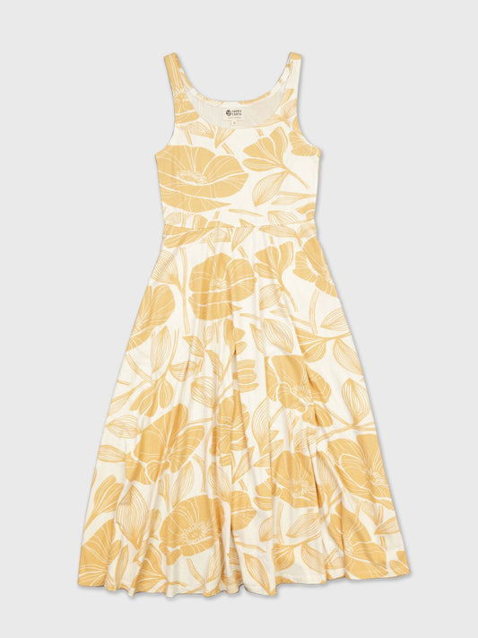 Bright and cheerful, just like the sun-loving flowers that inspired the design. Daisies wrap around the bottom hem, gradually becoming more sparse as the pattern extends up the dress. Free-form and flowy, this floral pattern serves soft, natural style.