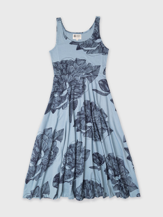 A coastal cottage twist on a tropical pattern. Large peony blooms cover this sky blue tee. The peony is a favorite floral in cooler climates and a signature of spring + summer.