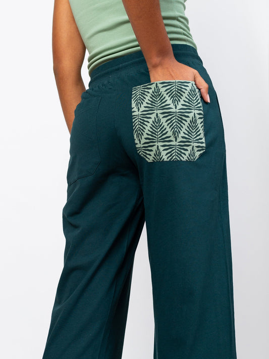 A pattern of prehistoric plants, the natural geometry of the ancient fern, decorates the pocket on this teal pant.