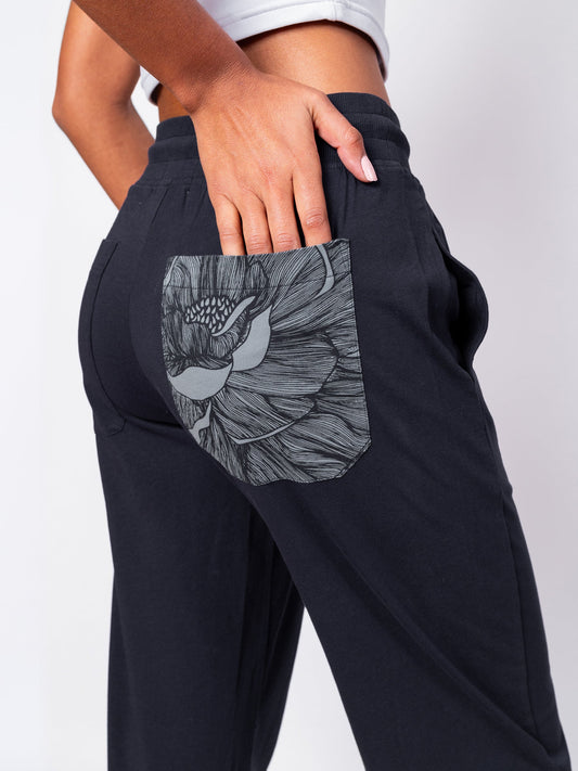 Navy wide-leg pants with a light blue floral accent pocket — coastal grandma chic gets comfy.