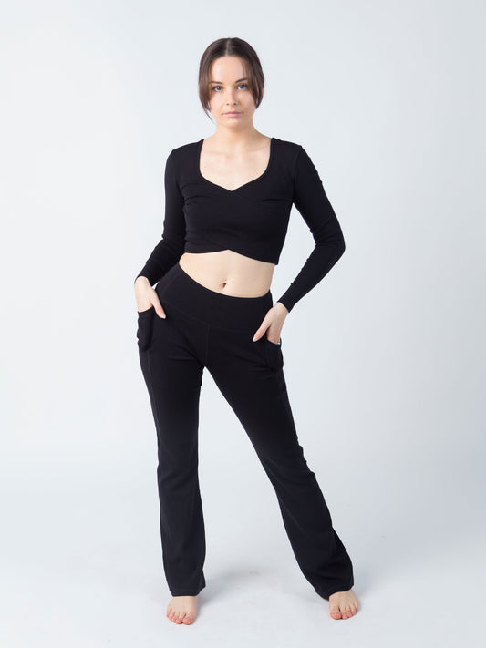 Structured support where you want it, stretchy comfort where you need it. These flexible flare leggings have a supportive waistband and deep side pockets. Fitted to the knee, with a flattering flare bottom.