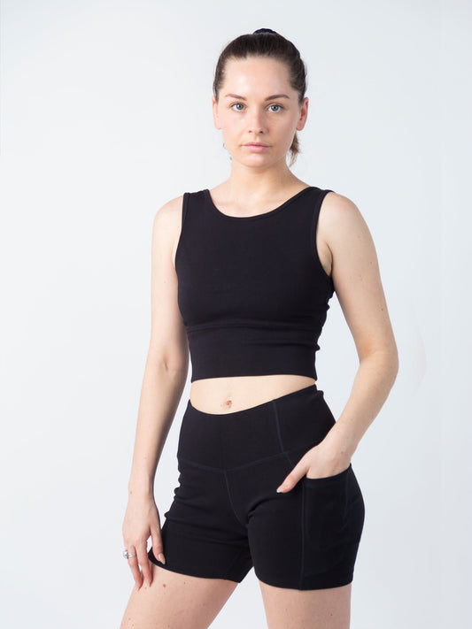 In a world of polyester and nylon, we're breaking the trend with our eco-conscious performance fabric crafted from ribbed organic cotton. In Eclipse black.