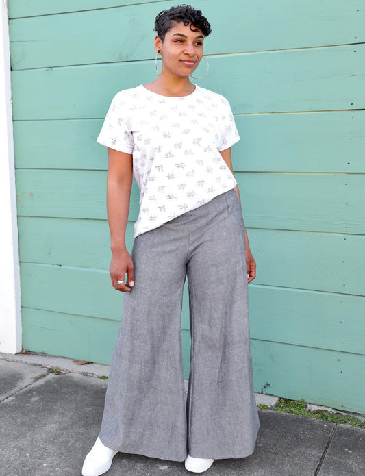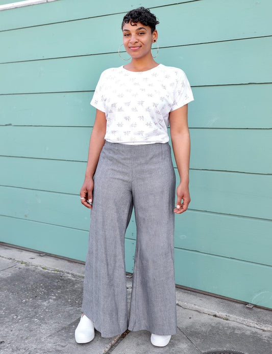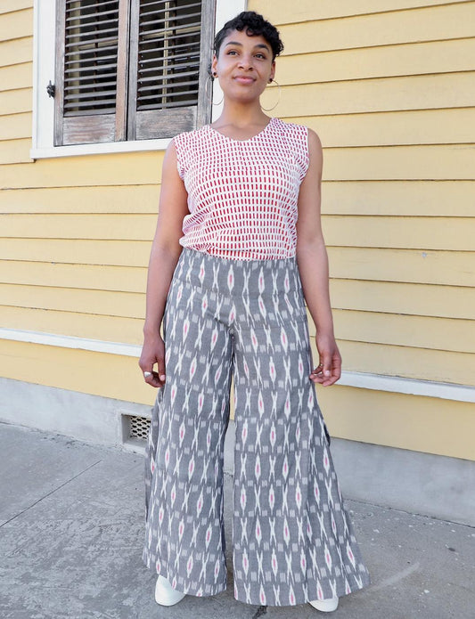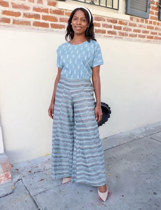 Vendor:Passion LilieRegular price $54.00Regular priceUnit price perSale price $54.00Wide leg pants are IN! Take the plunge with our Shaila Pants in a blue, white and gray handwoven ikat fabric. The flat front waistband and elastic back waistband ensure comfort and the most flattering shape. These wide leg pants are curve friendly and flattering for those with fuller thighs, hips or bottoms.