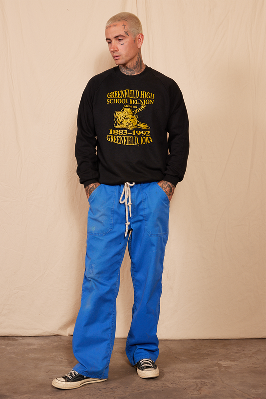 Gorgeous 1970's Vintage Patchwork Euro Pant, featuring the iconic French Bleu de Travail color and patched detailing. With deep workwear pockets and patched front panels, these pants are truly cool and unique. Keep it casual with one of our band sweatshirts or pair it with one of our matching chore coats to complete the workwear look. Shows signs of wear, with some unique markings and patches. See photos for details.