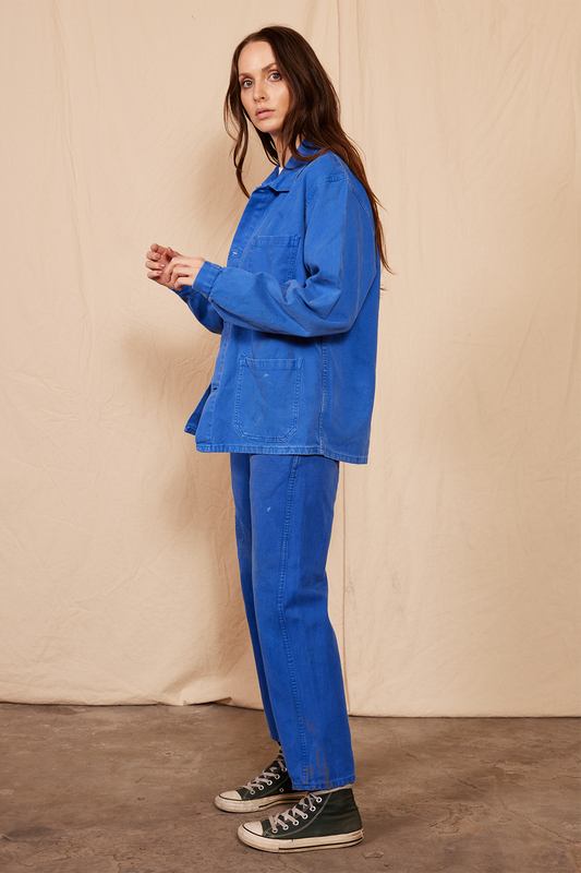 Super cool 1970's Vintage Euro Work Pant, featuring authentic Ailee zipper and the iconic French Bleu de Travail ("work blues") color. Made with a relaxed fit and constructed with a Moleskin material, these pants add a unique vintage flair to any outfit. Shows signs of wear, with some unique markings. See photos for details.