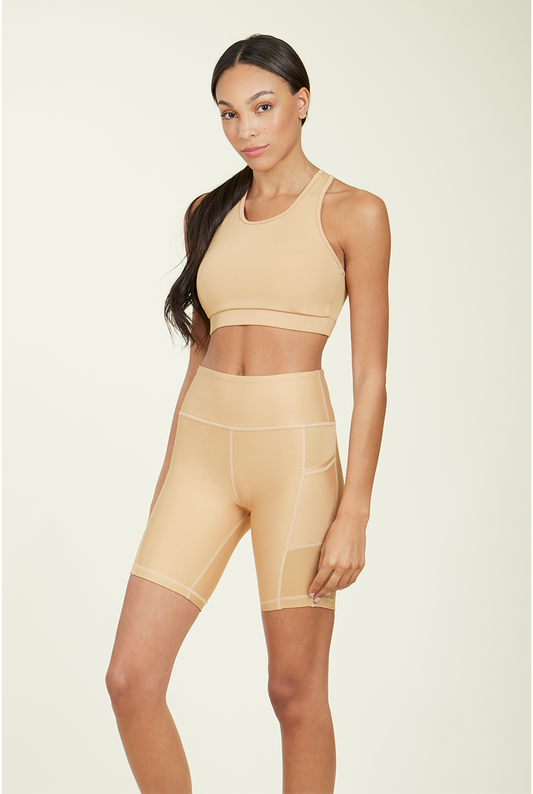 High-waisted biker short with flatlock stitching. Side pocket for valuables. Mesh detailing on the bottom. Look good, play good and most importantly feel good.
