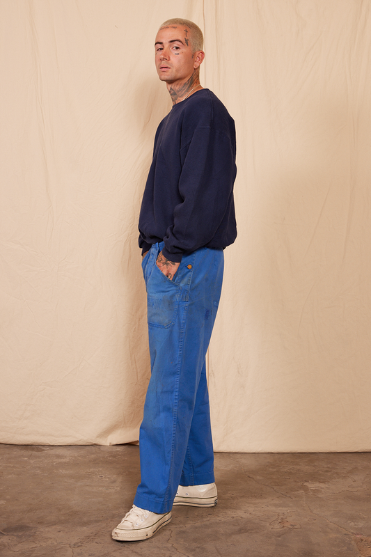 A wardrobe staple. This Vintage 1980s Navy Sweatshirt is crafted from a blend of cotton and polyester, making it ultra soft and comfortable. With a slightly wider collar and slouchy fit, this sweatshirt is understated yet stylish. Rock it with some vintage workwear trousers or keep it more casual in sweats.