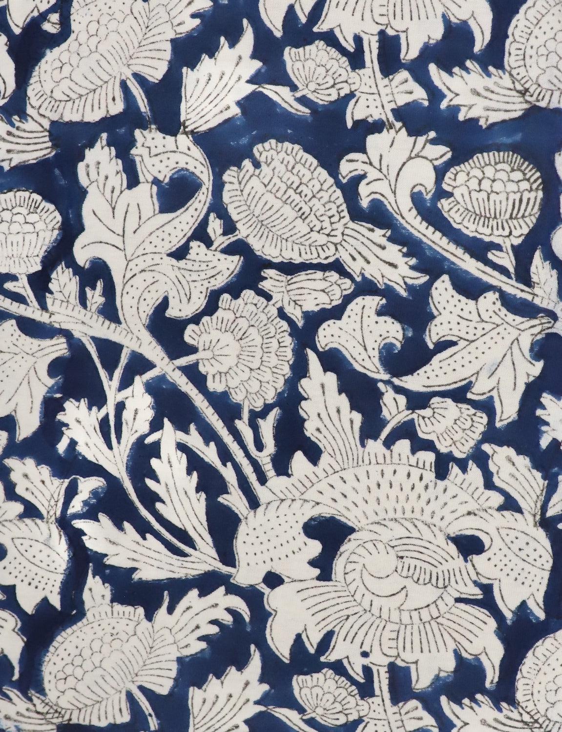 This blue floral top is a true work of art! Handmade by artists in India, each detail is thoughtfully designed with beauty and function in mind. Our wrap tops are flattering and comfortable, made with 100% organic cotton.