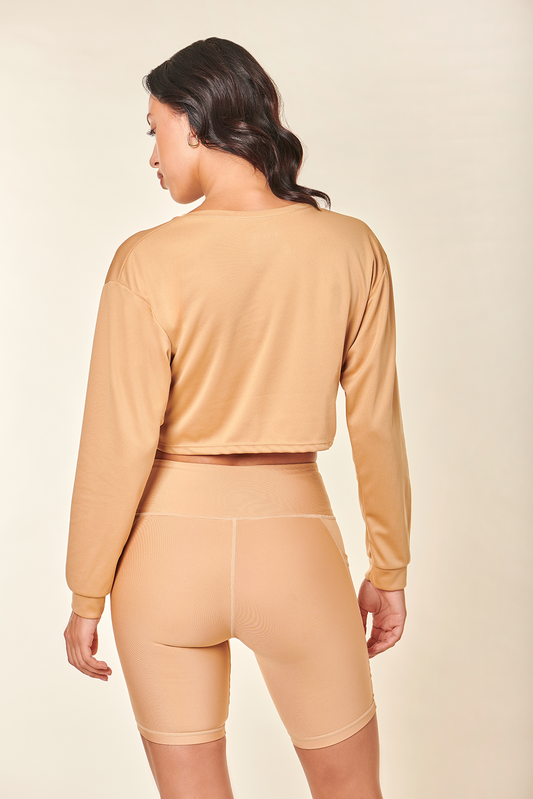 This cropped, crewneck long sleeve features a clean, straight hem and relaxed raglan sleeves. It's classic cut and perforated mesh fabric allows effortless layering capabilities.