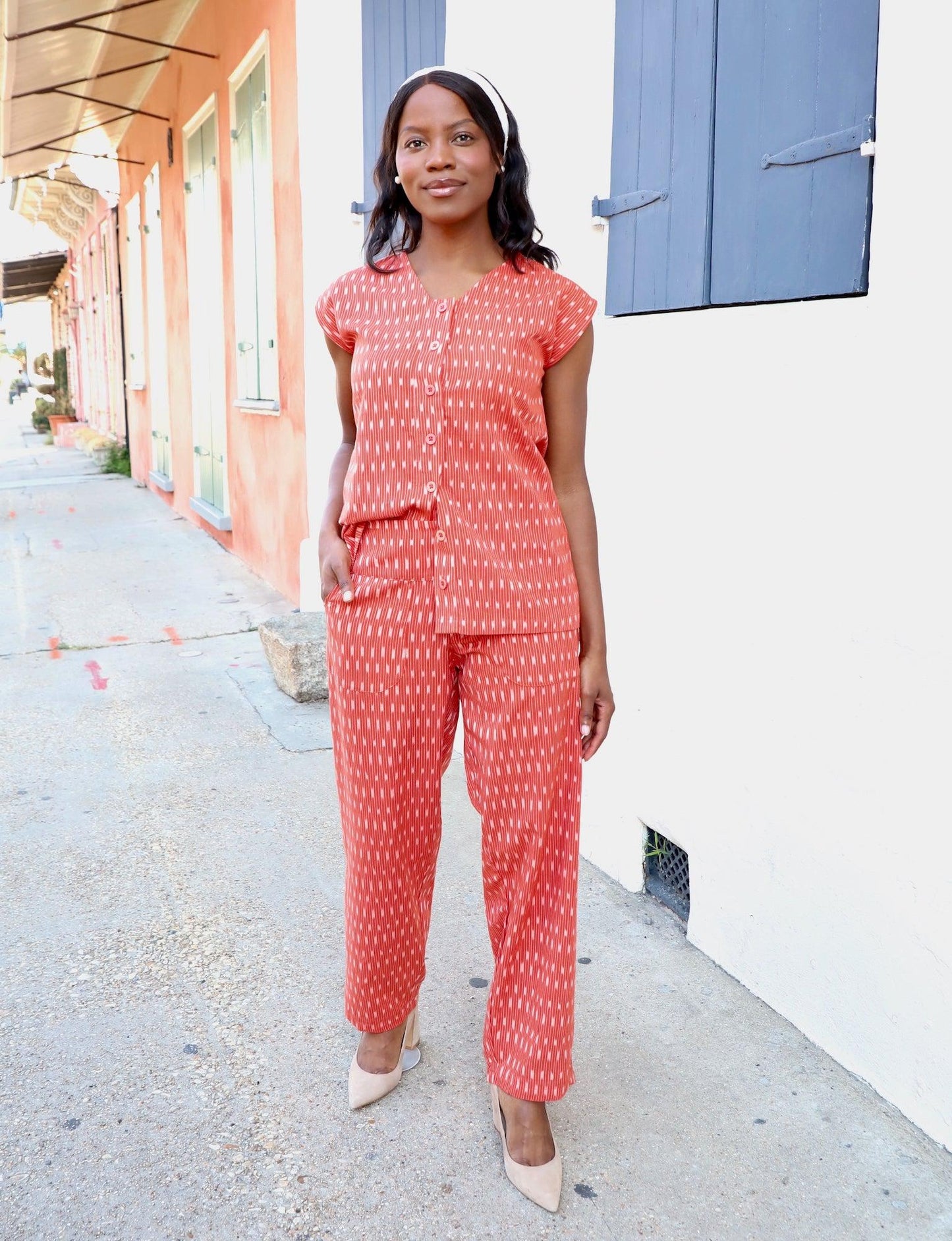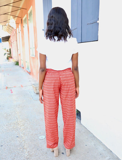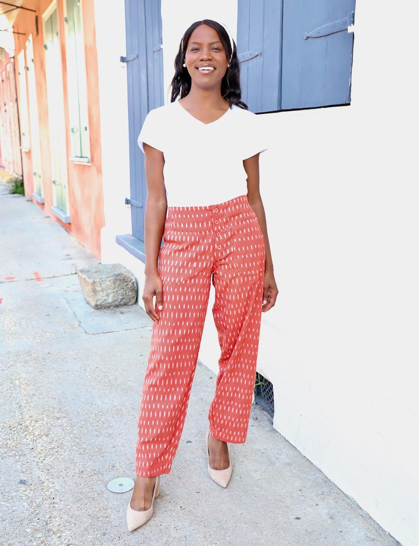 • Our Aurora pants are the splash of color your closet is craving. These red pants are both timeless and fun, especially perfect for summer holidays and festivities. Wear the Aurora Pants out to dinner or to the beach, just pair them with a t-shirt and wedges or tennis shoes and you are ready to go. These pants have a straight leg, hit at the ankle, have elastic in the back for easy sizing, a front button fly closure and feature nice deep pockets in the front. These red pants are curve friendly and flattering for those with fuller thighs, hips or bottoms.