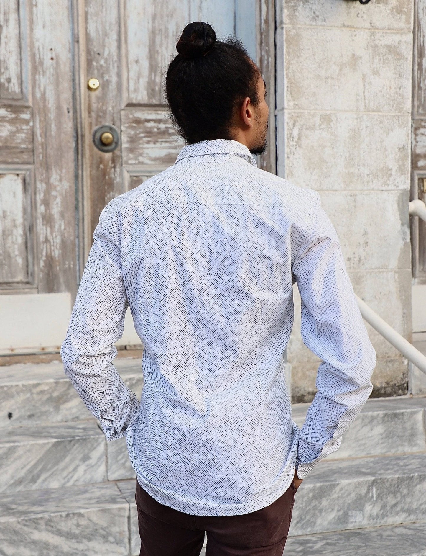 • A long sleeve men's button down shirt in white with a small light blue dot block print. Gentle tapering at the waist with a straight and narrow profile and a broader fit in the shoulders gives this shirt the perfect fit.