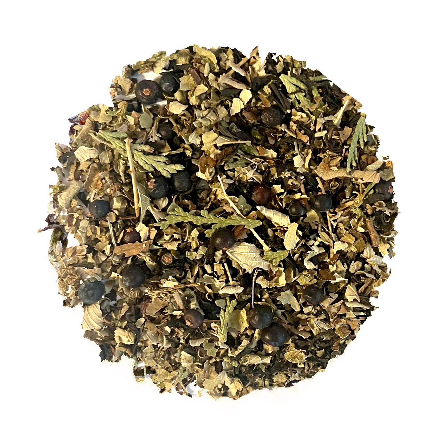 But that's not all – Beards Hollow Tea carries an added touch of the coastal uplands' woodland charm. Infused with wild foraged Western Hemlock needles and organic juniper berries, this tea evokes the serene beauty of the Pacific Northwest's forests. With each sip, you'll find yourself transported to a secluded hideaway amidst the woods, where the aroma of smoky fires and the essence of the forest dance in perfect harmony.