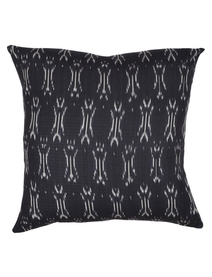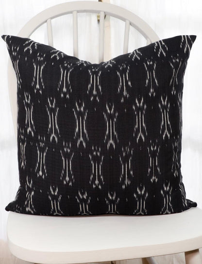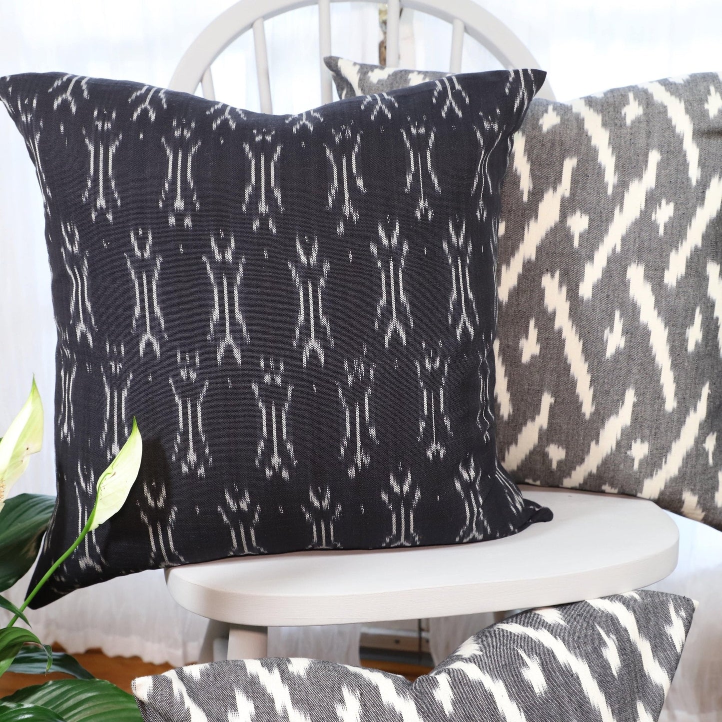 Made of a beautiful hand woven ikat fabric in a black and white geometric pattern, this ikat black pillow cover would pair great with neutral greys and whites or pop-ups of bold colors. It has a unique handmade quality that will not go unnoticed. The back side has a flap and button closure to make sure your pillow insert stays snug and perfectly styled.