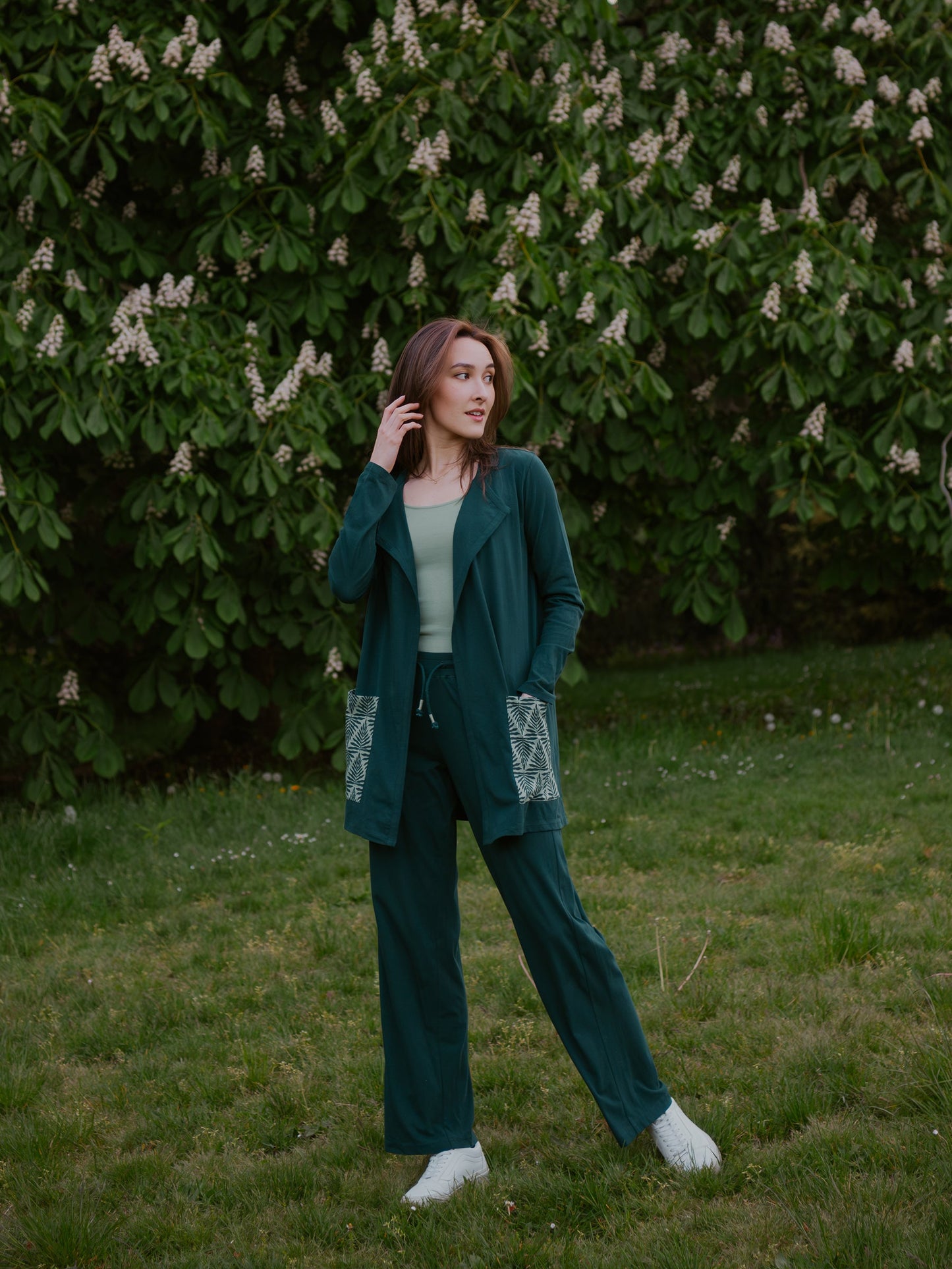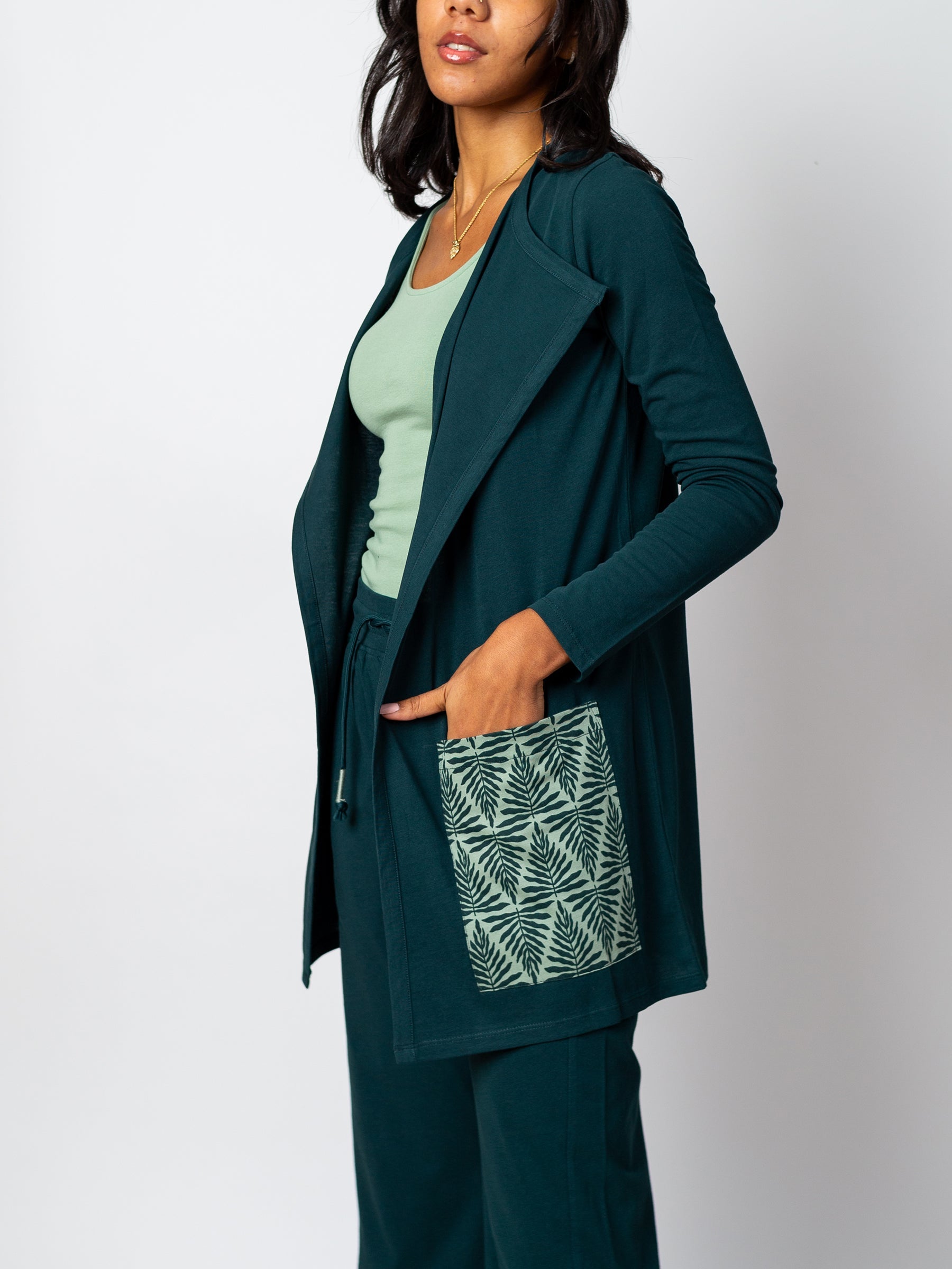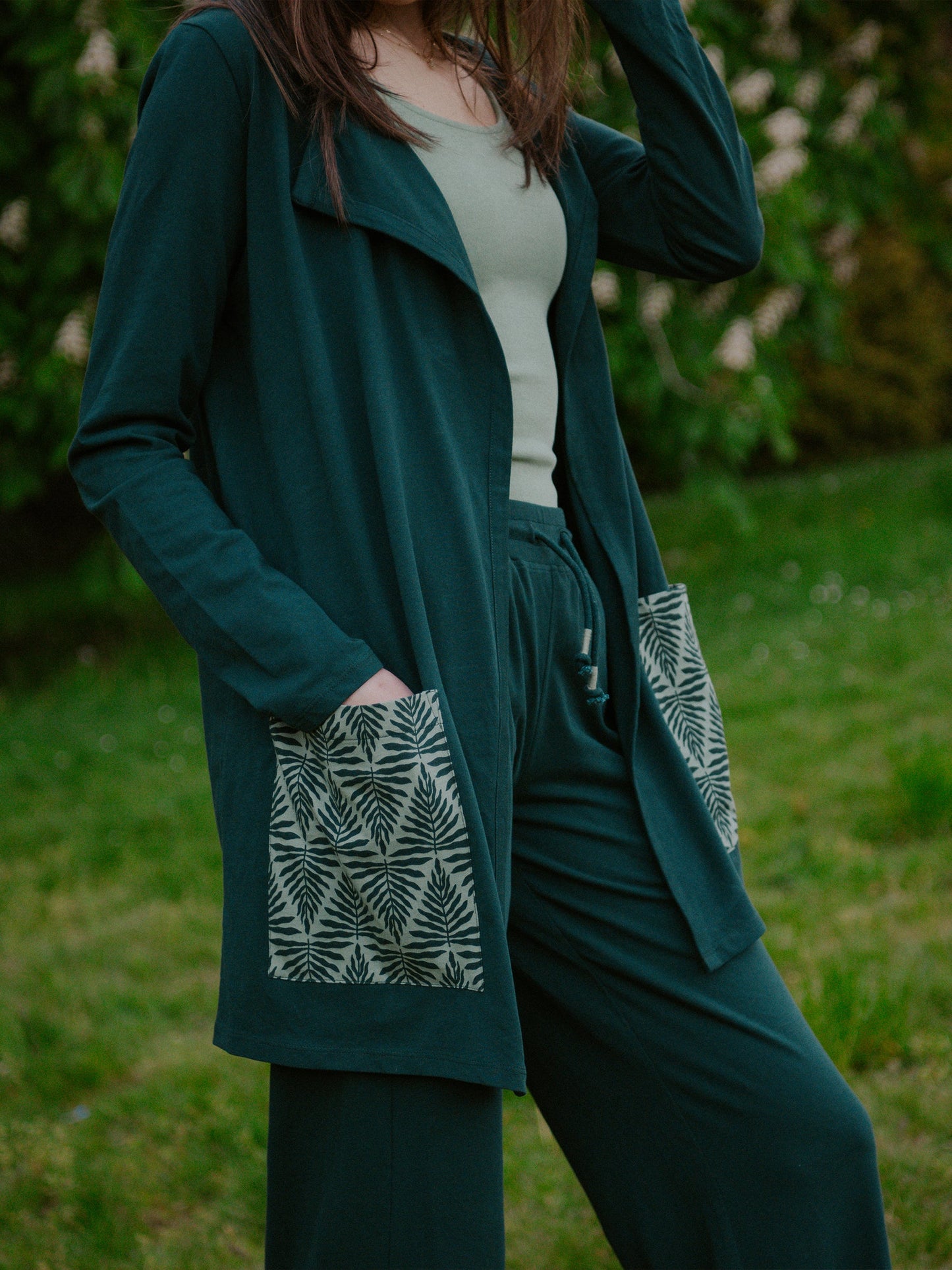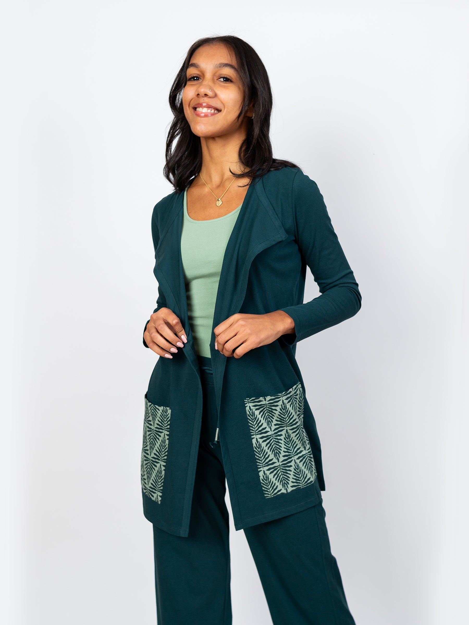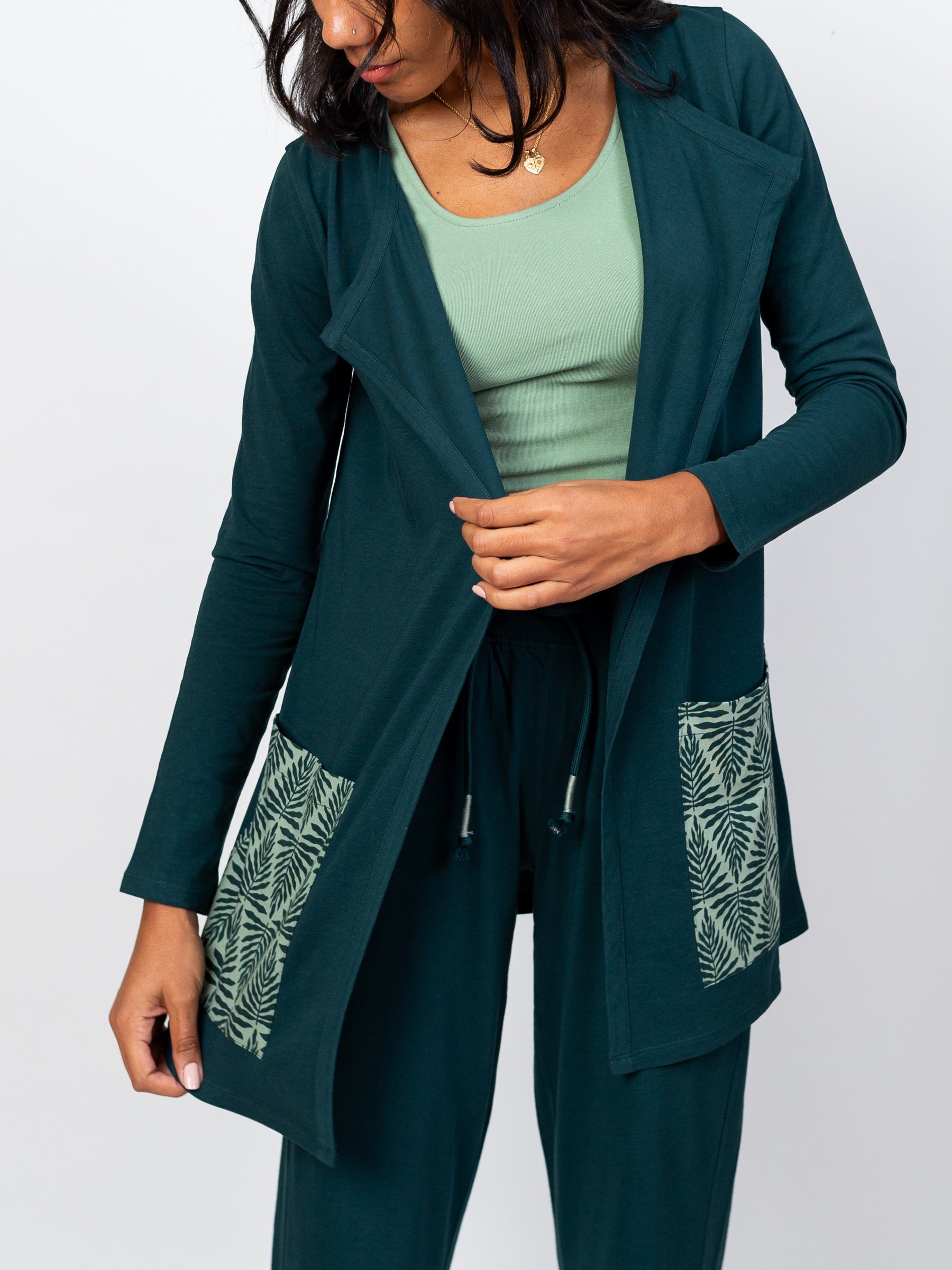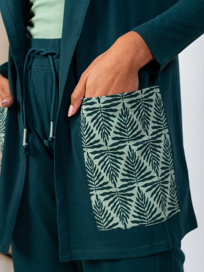 Monstera-colored open-front cardigan with stylish pockets featuring ferns in a subtle chevron pattern. The perfect light-layer that adds a touch of personal flare.