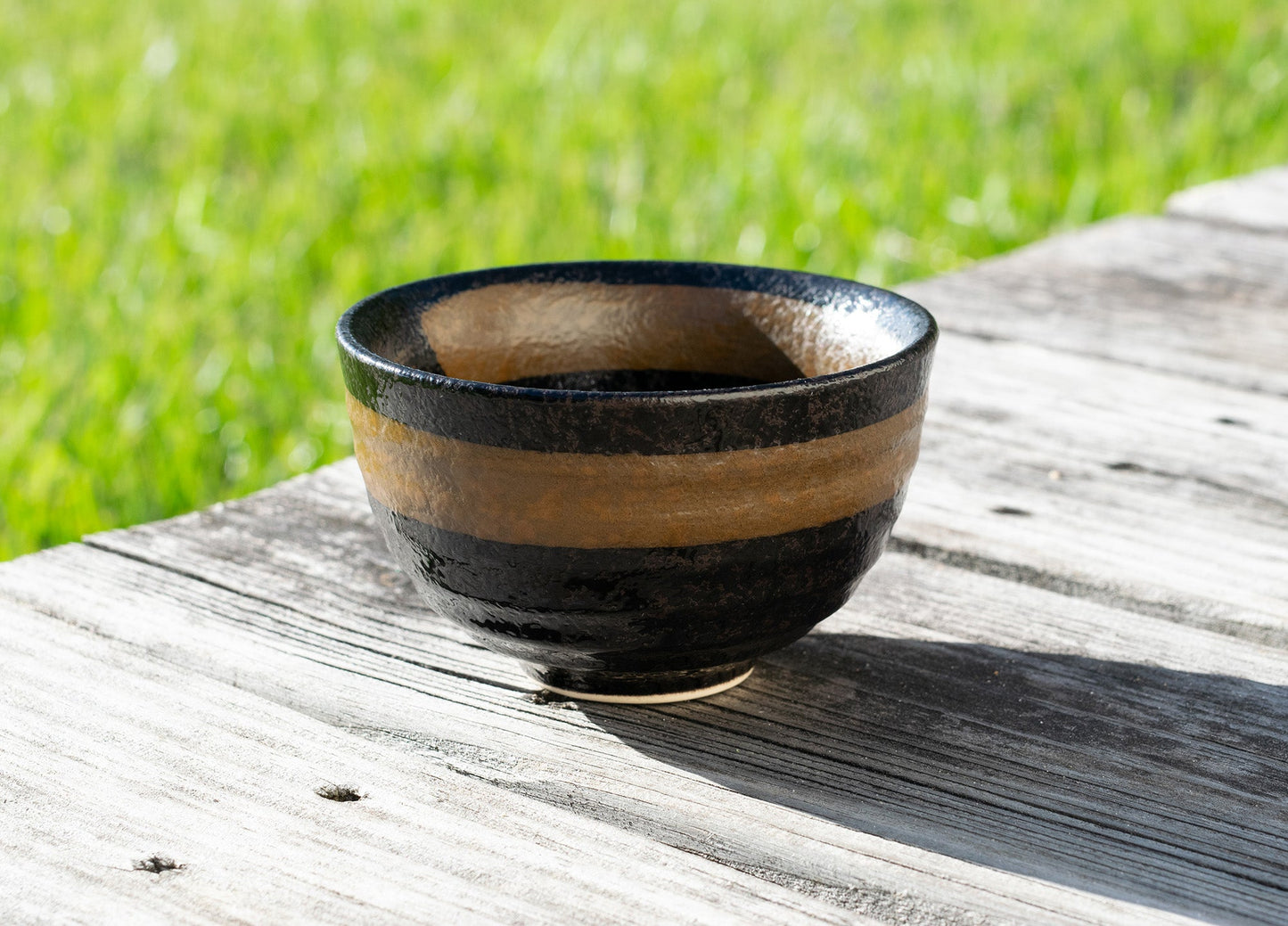 A dark brown ceramic matcha bowl with a light brown stripe, which is hand-brushed by craftsmen.