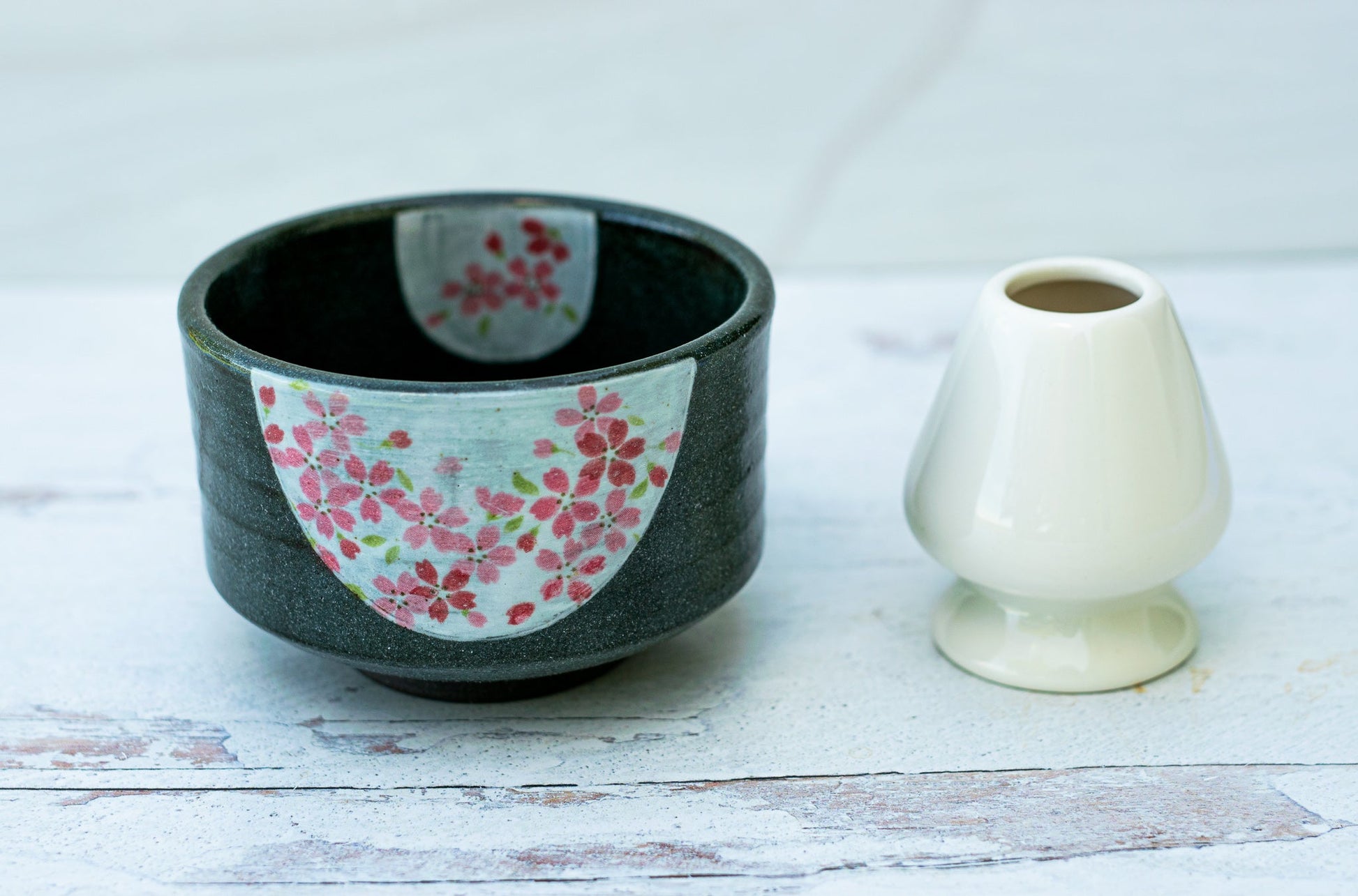 A grey ceramic matcha bowl with tiny pink flowers, which are hand-brushed by craftsmen.