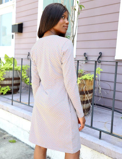 • Be different this fall with our Deauville pink checkered dress. With its unique neckline and darts in the front and back for a tailored look, you will look oh so chic. Plus, the pockets and long sleeves will keep you comfortable and warm.